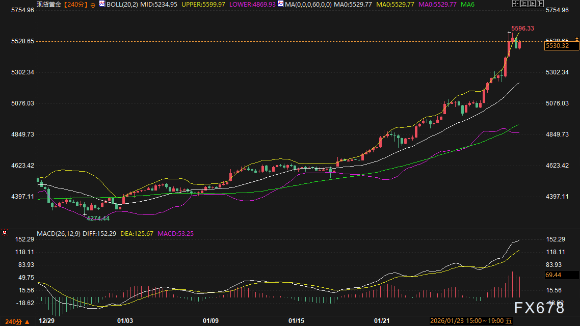 黄金避险买盘炽热,但技术极端引发回调忧虑 黄金的暴涨是当前市场最引人注目的景象。其上涨动能部分源于美元的系统性走弱,但更主要的是由强烈的避险情绪驱动。这种避险情绪并非完全来自对美债信心的丧失,而是可能源于对全球地缘局势(如俄乌局势)的持续焦虑,以及对特朗普关税言论可能引发新一轮市场动荡的担忧。资金流向黄金这类被视为终极避险的资产,尽管其流动性远不如美元。 MH官网:然而,黄金的上涨已进入极端区域。有分析尖锐指出,当前黄金的上涨“极度无序”,且显著增加了反转风险。从技术指标看,现货黄金240分钟图显示价格已突破布林带上轨(5600.26美元),MACD指标金叉且正值持续放大,多头动能强劲。但一个关键风险信号是:金价已远超20个月布林带上轨(约4812美元/盎司),这种走势在技术上被定义为“极度拉伸”。历史上,任何极端走势都是潜在风险的信号。更值得玩味的是,尽管金价飙升,但期货市场的净多头仓位并未达到与之匹配的历史高位,这表明本轮买盘可能来自不同的、或许更倾向于中长期持有的资金(如央行或大型机构),而非纯粹的短期投机盘。一旦这部分买盘力量暂歇,市场缺乏后续接力,技术性回调的压力将急剧增大。 关键阻力区间:5600 - 5650美元。此处是当前布林带上轨延伸区域及整数心理关口,金价在此区域已显现冲高回落压力。 核心支撑区间:首先关注5500 - 5530美元,此处是近期强势上涨的盘中整理平台及心理支撑。更重要的支撑在5400 - 5430美元区域,该区域汇集了前期高点转化支撑及短期趋势线。 盘中关注点:需密切关注金价对5600美元关口的反复测试情况,以及每次冲高后的回落力度。若跌破5500美元,则可能意味着短期调整深度将加大。