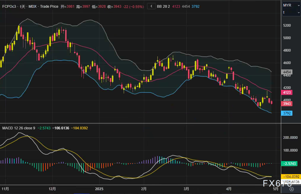 周二(4月29日),马来西亚棕榈油期货(FCPOc3)连续第二日收跌,7月合约收盘报3940林吉特/吨,跌幅0.63%。林吉特走强(兑美元升值0.8%)及竞争油脂疲软共同施压盘面,技术指标显示短期下行压力未消——布林带(20,2)中轨位于4454林吉特,MACD仍处负值区域,暗示市场尚未摆脱空头主导格局。