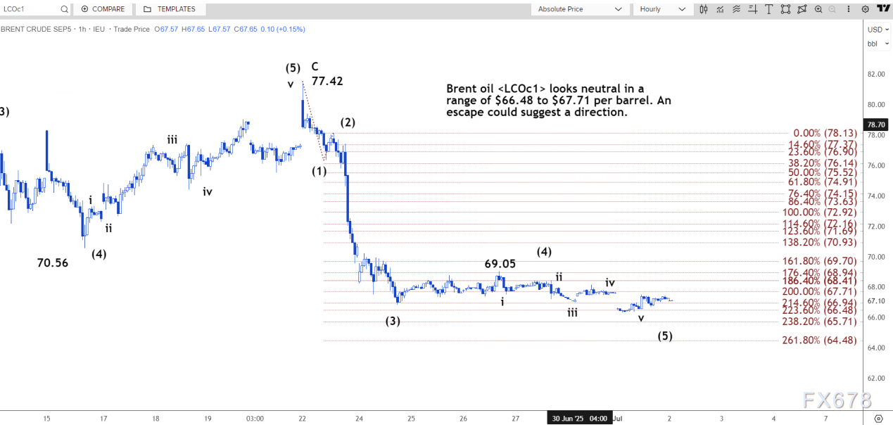 路透技术分析师指出,布伦特原油在每桶66.48美元至67.71美元区间内呈现中性走势。突破这一区间可能预示着未来走势。
