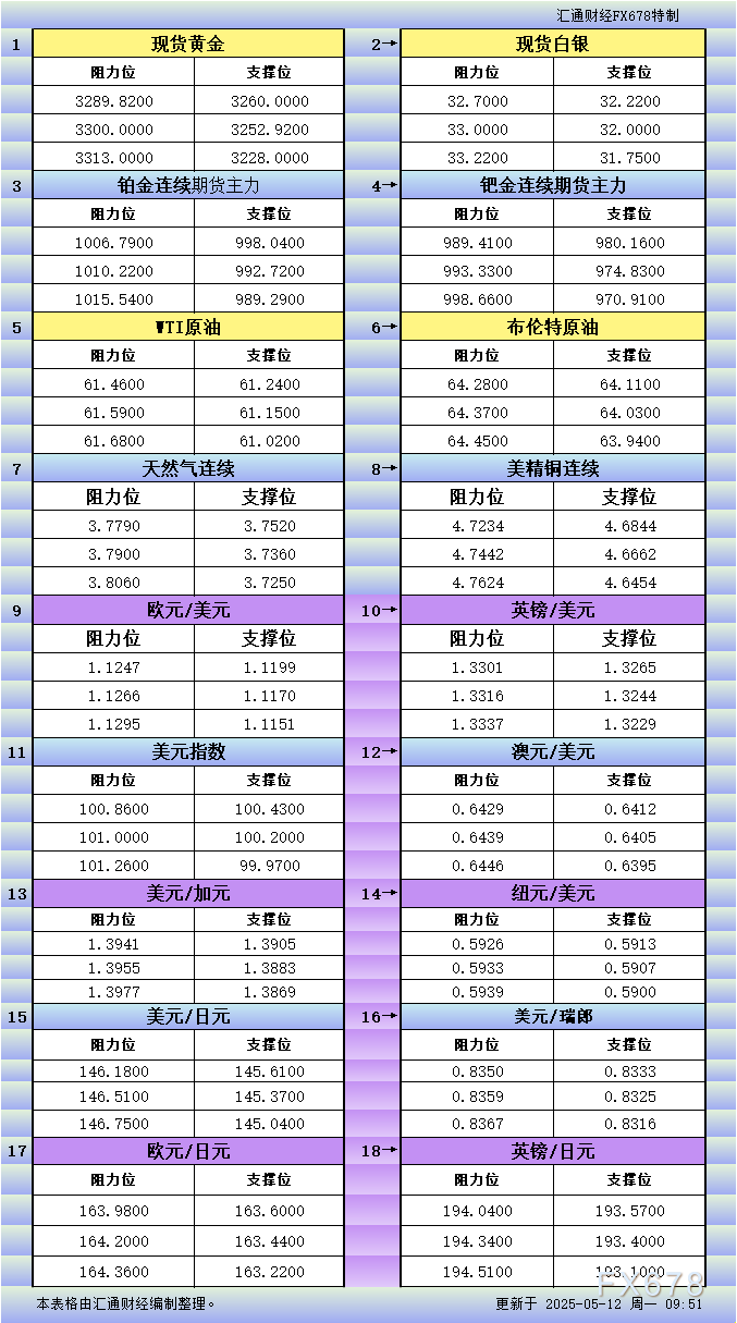 MH平台官网:5月12日亚市更新支撑阻力:18品种支撑阻力(金银铂钯原油天然气铜