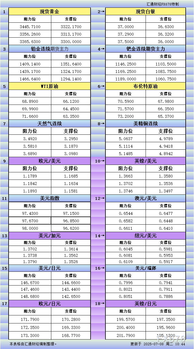 MH外汇官网7月8日亚市更新支撑阻力:18品种支撑阻力(金银铂钯原油天然气铜及十