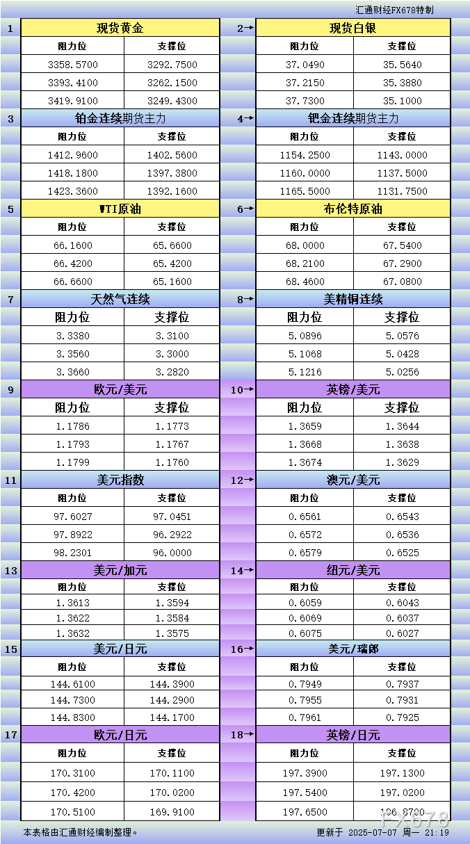 MH外汇官网7月7日美市更新支撑阻力:18品种支撑阻力(金银铂钯原油天然气铜及十